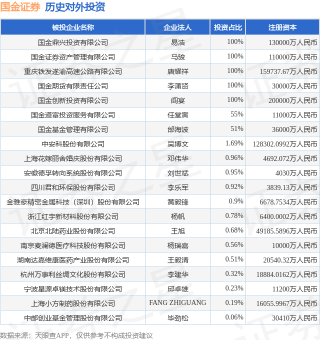 本站音讯,字据天眼查APP清晰,国金证券(600109.SH)新增全部对外投资事件,被投资公司为宁波星源卓镁期间股份有限公司,法定代表东谈主邱卓雄,投资占比为0.23%。该公司从事金属成品业,注册成本为11200万东谈主民币。当今,国金证券共存在对外投资20项,详见下表: